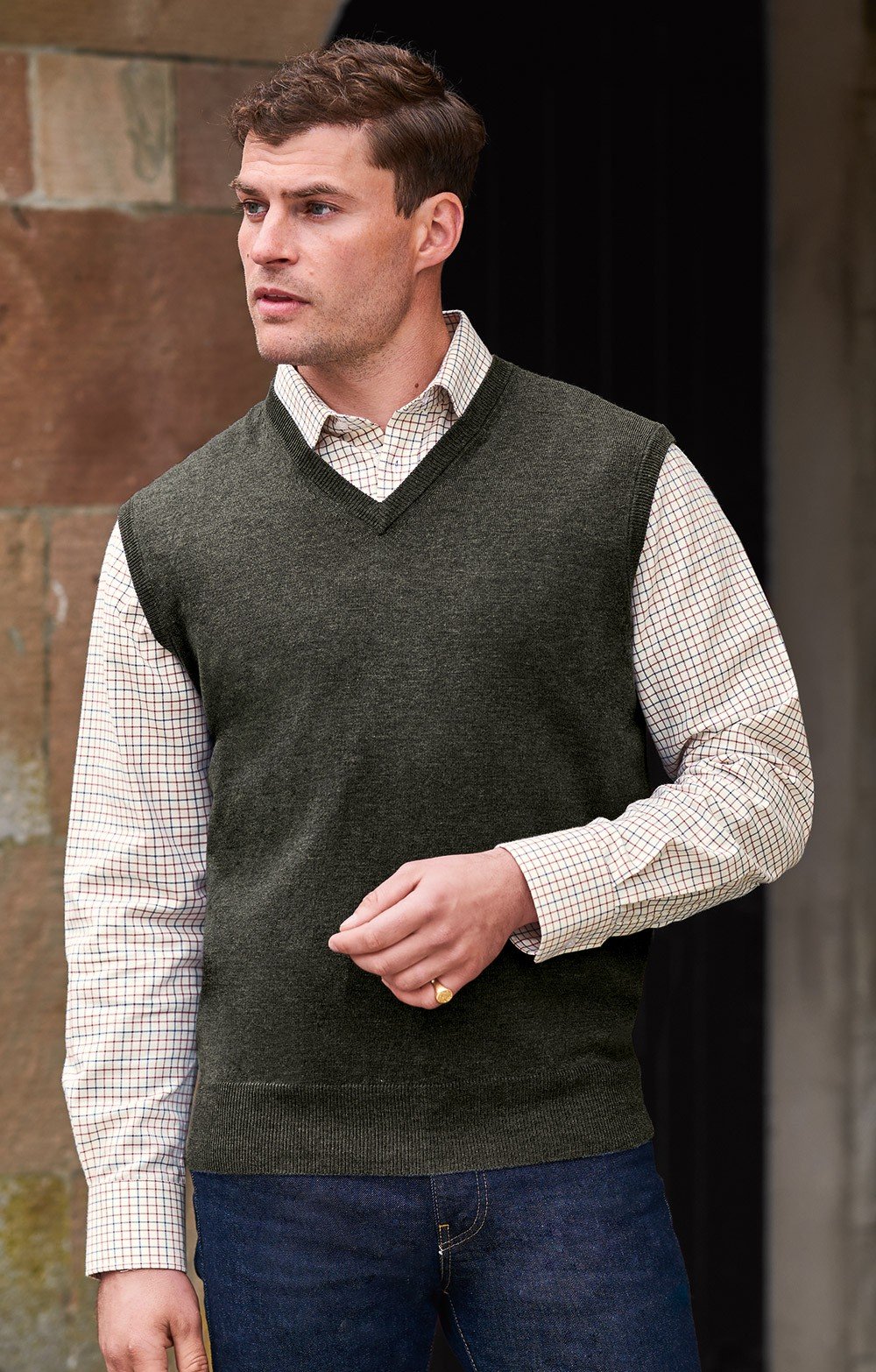 Classic V-neck tank in soft merino woolRibbing to the neckline, arms and hemFine knitDesigned by The House of BruarSuperbly insulating without being weighty, this piece will look great with a simple tattersall shirt and smart jeans, but could equally be dressed up under a country blazer.