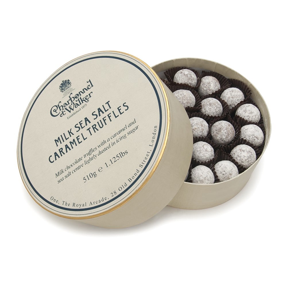 Milk chocolate (sugar, cocoa Butter, whole Milk powder, cocoa mass, emulsifier (soya lecithin), natural vanilla flavouring), salted caramel (37%) (glucose syrup, sweetened condensed skimmed Milk, palm kernel oil & palm oil (from a sustainable source), sea salt (0.9%), emulsifier (mono and diglycerides of fatty acids)), icing sugar. Milk chocolate contains cocoa solids 33.5% minimum, Milk solids 20.5% minimum