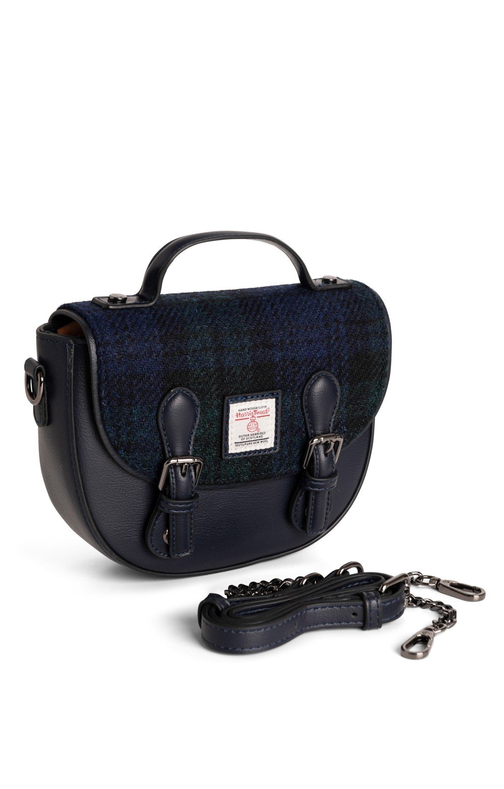 Half moon-shaped small handbag in PU leather.Harris Tweed® covering to flap.Double magnetic clasp fastening.Fully lined.Detachable and adjustable cross-body strap.Rear zip compartment.Internal zip pocket.Harris Tweed® trademark label.This delightful design will make an excellent addition to your own handbag collection, or why not purchase it for someone and introduce them to the wonderful world of Harris Tweed® accessories?