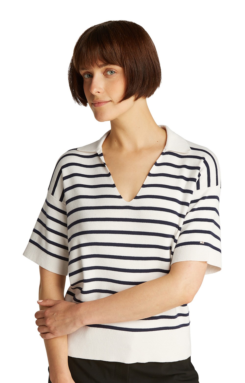 Organic cotton fabricMini striped patternOpen placket designPolo collarTommy Hilfiger flag embroidery on chestPair with a pleated skirt and ballet flats for a chic ensemble or style with denim jeans and ankle boots for a more casual look.