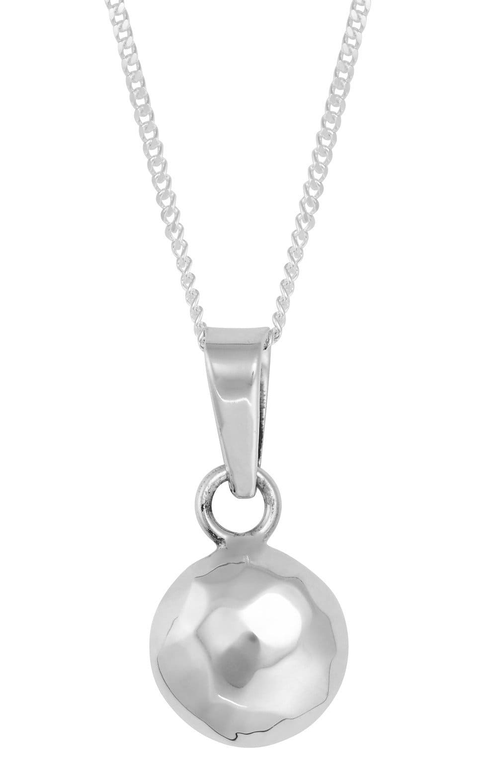 Ball pendant and bale in sterling silver18" chain in sterling silverBeaten texture to sphereWonderfully wearable, this pendant and chain combination make a charming standalone piece, or can be layered with other white metals for a Bohemian look.