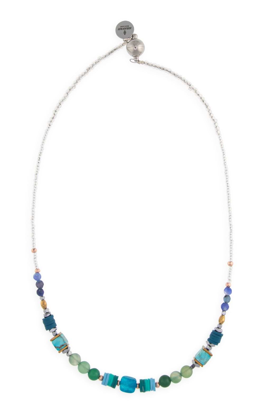 Each individually selected stone strung upon the chain brings its own character, creating a striking mix of texture and tone. The green and blue tones of this piece provide a sense of calm to any jewellery collection and a nod towards Arran Bay's coastline roots.The final arrangement is finished with polished metal accents and a secure magnetic clasp with safety chain, creating a balanced contemporary design.