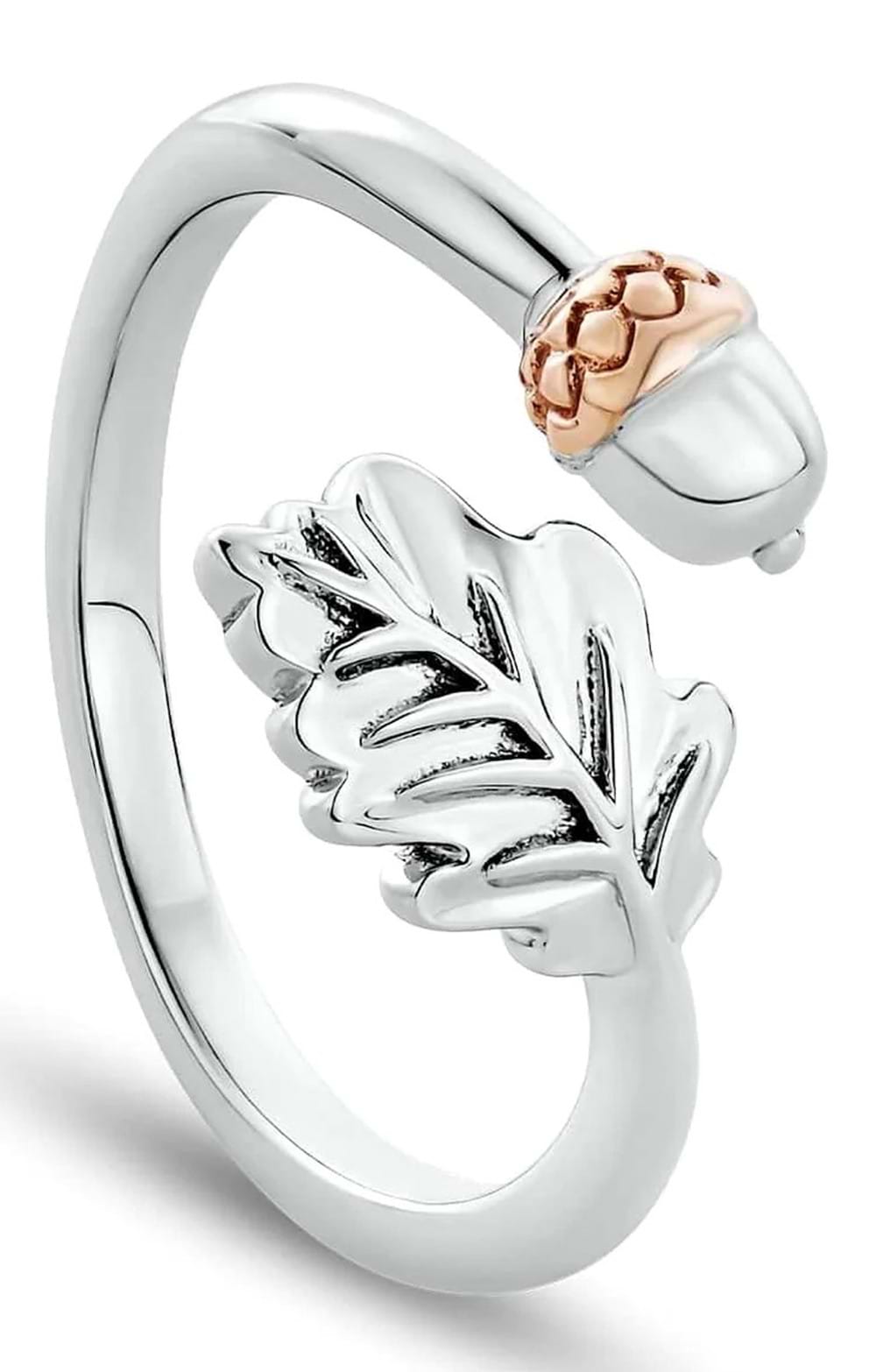 The ladies Clogau oak leaf ring features sterling silver with rare Welsh gold, with an oak leaf motif in a symbol of strength and nobility.