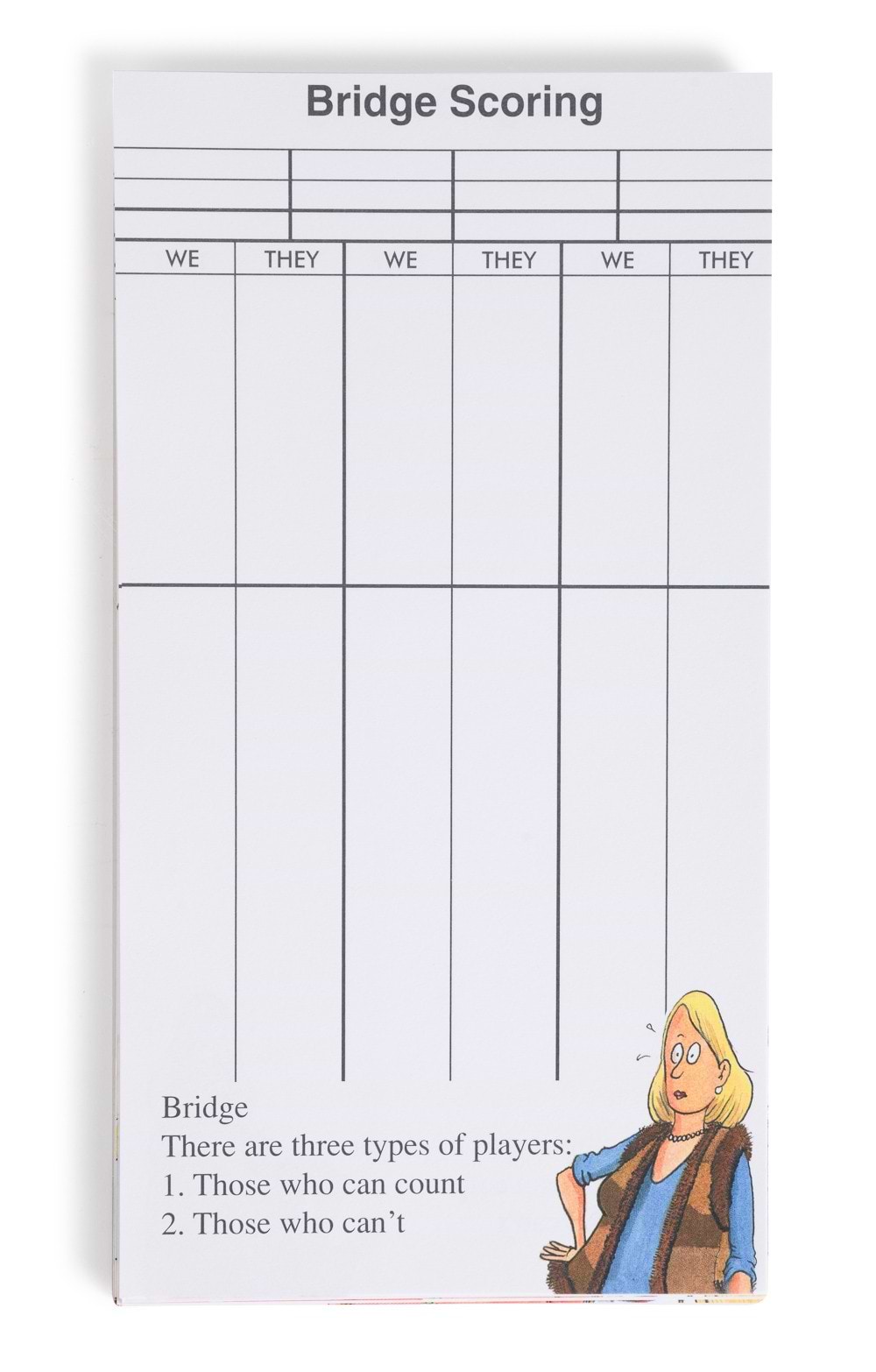 Pack of 24 double-sided bridge score cardsDecorated by several different Oliver Preston cartoonsPerfect small gift or stocking fillerAs well as raising some smiles at your own bridge parties, these cards will make a wonderful small gift or stocking filler, especially as they can be added to a slim envelope that can fit a letterbox.