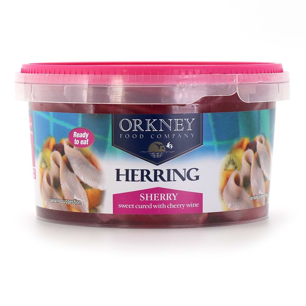 Ingredients: Cured skinless fillets of Herring (FISH)(44%), water, sugar, onion, sherry (3.2%), spirit vinegar, cherry wine (1.7%), salt, lactic acid, citric acid, preservative: E211.