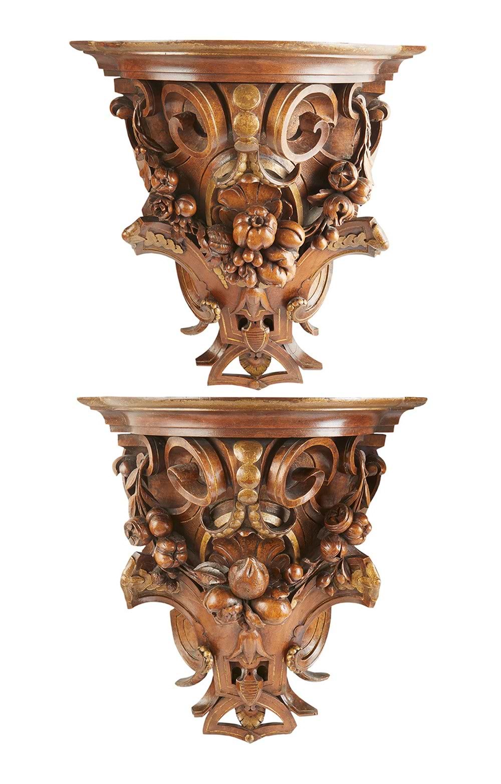 PAIR OF CARVED WALNUT PARCEL-GILT WALL BRACKETS, 19th Century