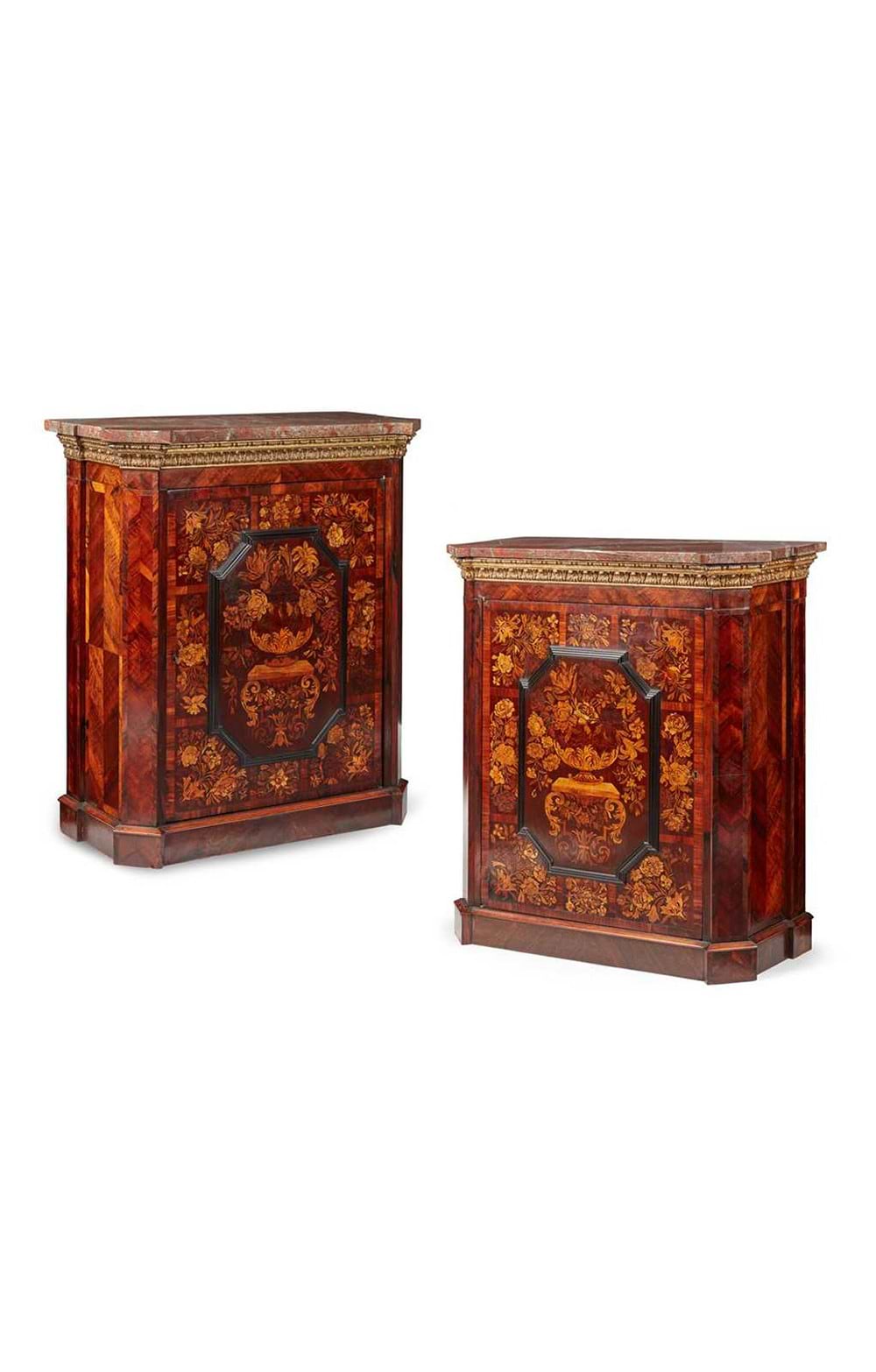 Pair Of Fine Dutch Rosewood And Marquetry Marble Topped Pier Cabinets, 19th Century