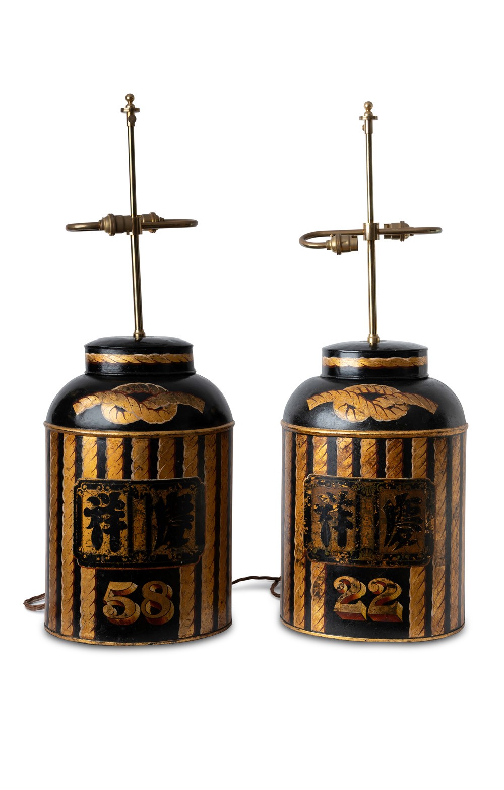 Pair of Painted and Parcel Gilt Tole Tea Canister Lamps, 19th Century