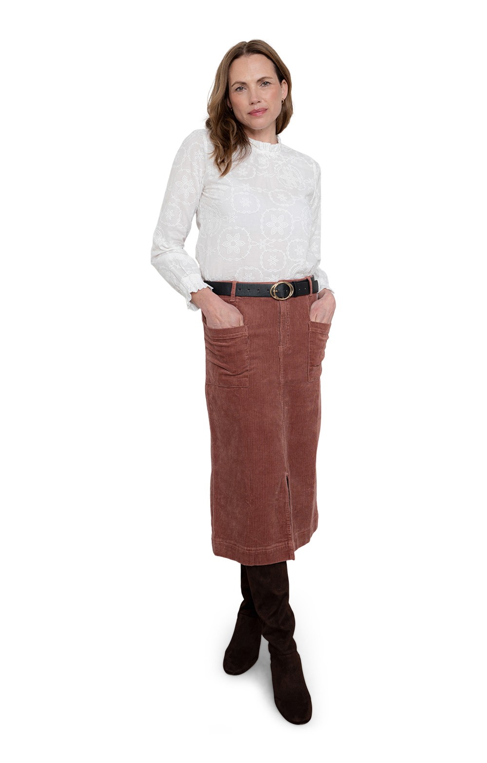 Shaped in soft cotton corduroy with a hint of stretch, this midi-length skirt combines tactile texture with everyday ease. A clean A-line silhouette is punctuated by a centre front split, adding movement and a subtly modern touch. Deep front patch pockets enhance the casual appeal while keeping practicality front and centre. Neatly finished with a button-and-zip fastening at the waistband, it's both polished and unfussy.