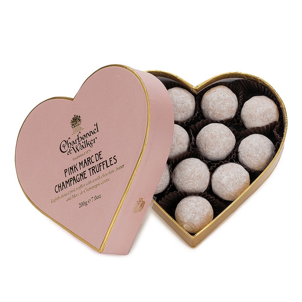 Pink Marc De Champagne Truffles:White Chocolate (51%) (Sugar, Cocoa Butter, Whole Milk Powder, Emulsifier ( Soya Lecithin), Natural Vanilla Flavouring), Milk Chocolate (28.5%) (Sugar, Cocoa Butter, Whole Milk Powder, Cocoa Mass, Emulsifier ( Soya Lecithin), Natural Vanilla Flavouring), Salted Butter (Milk) (12%), Marc De Champagne (2.5%), Icing Sugar, White Rum, Colour (Beetroot Red), Natural Flavouring.