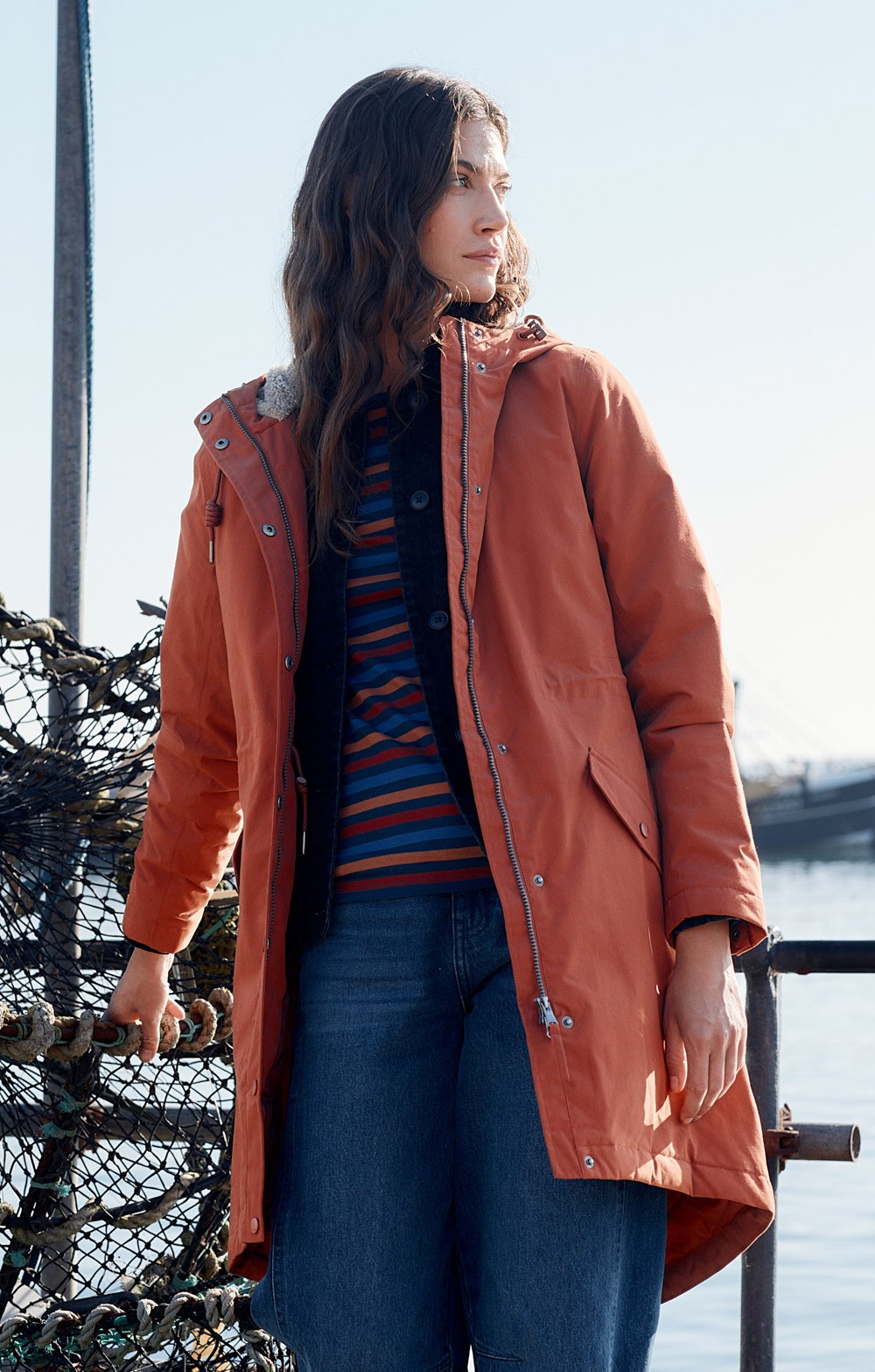 The soft fleecy lining in the upper body and hood, with recycled wadding elsewhere for snugness, coupled with a drawstring waist and parka-style hem for extra coverage provide a practical and stylish coat that you'll love to throw on when braving the elements.