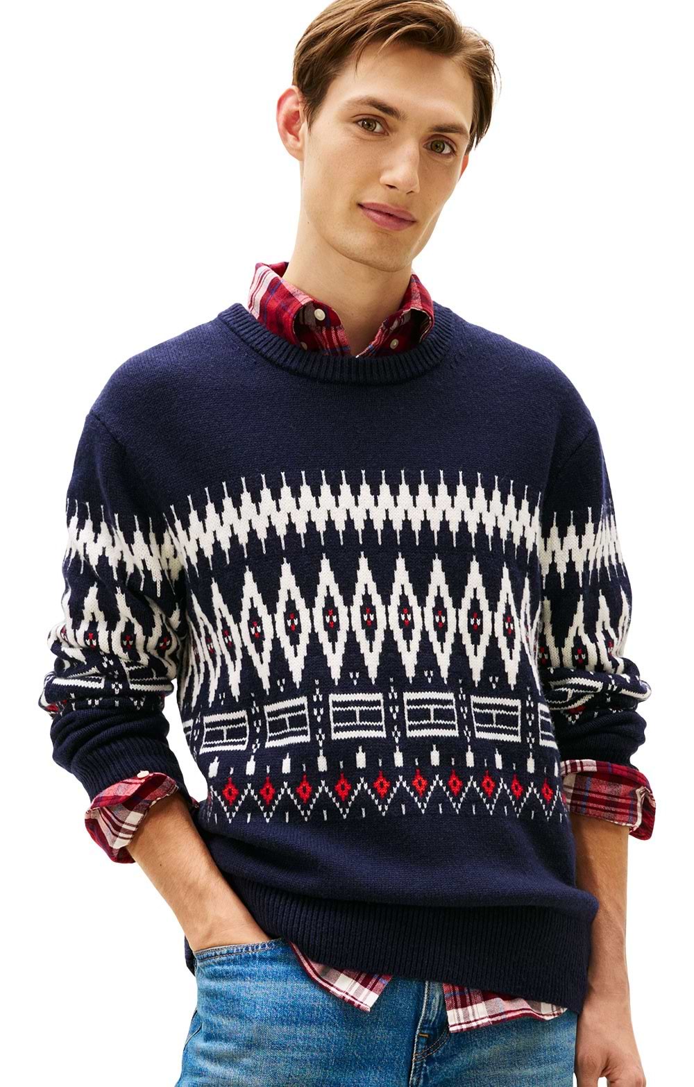 Fairisle-style crew neck jumperLambswool-richFairisleCrew neckRib-knit collar, cuffs and hemTommy Hilfiger flag logo in FairislePair over a red shirt and tailored trousers for a casual festive look fit for parties throughout the season.