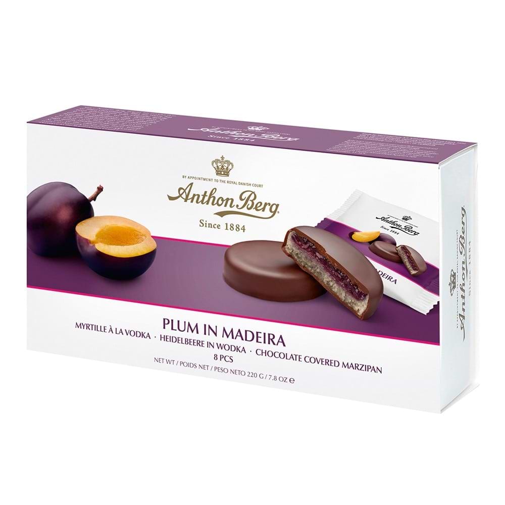 Sugar, plums 15%, cocoa mass, almonds 11%, apricot kernels, glucose syrup, cocoa butter, liqueur wine (Madeira 1.5% hereof), alcohol, milk fat, emulsifier (lecithin), thickener (pectin), preservatives (sorbic acid, potassium sorbate), acid (citric acid).