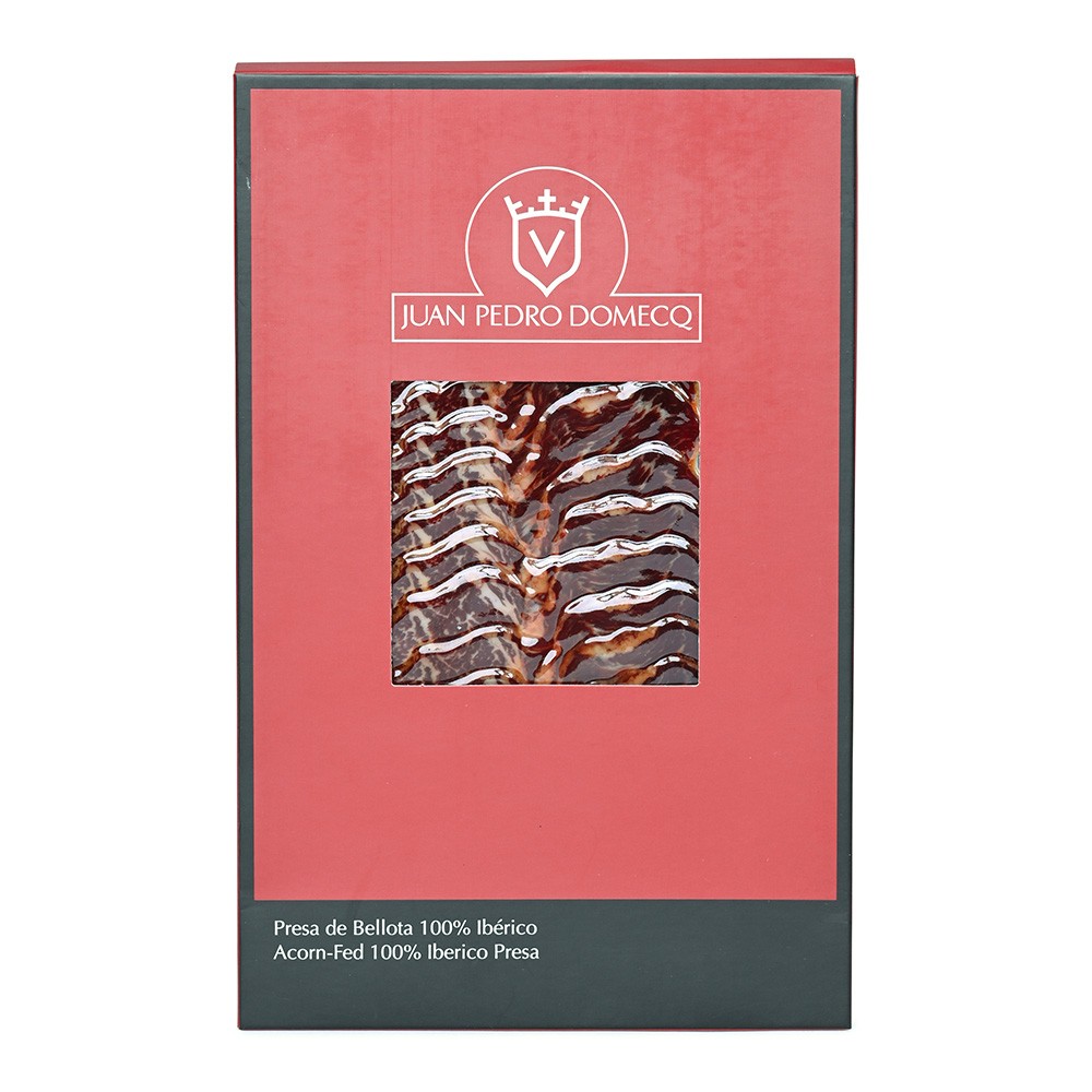 Acorn-fed 100% Iberico Presa sliced and vacuum packed from a Mamellado-lampi o breed pig. Free raised and artisanal cured for six months.