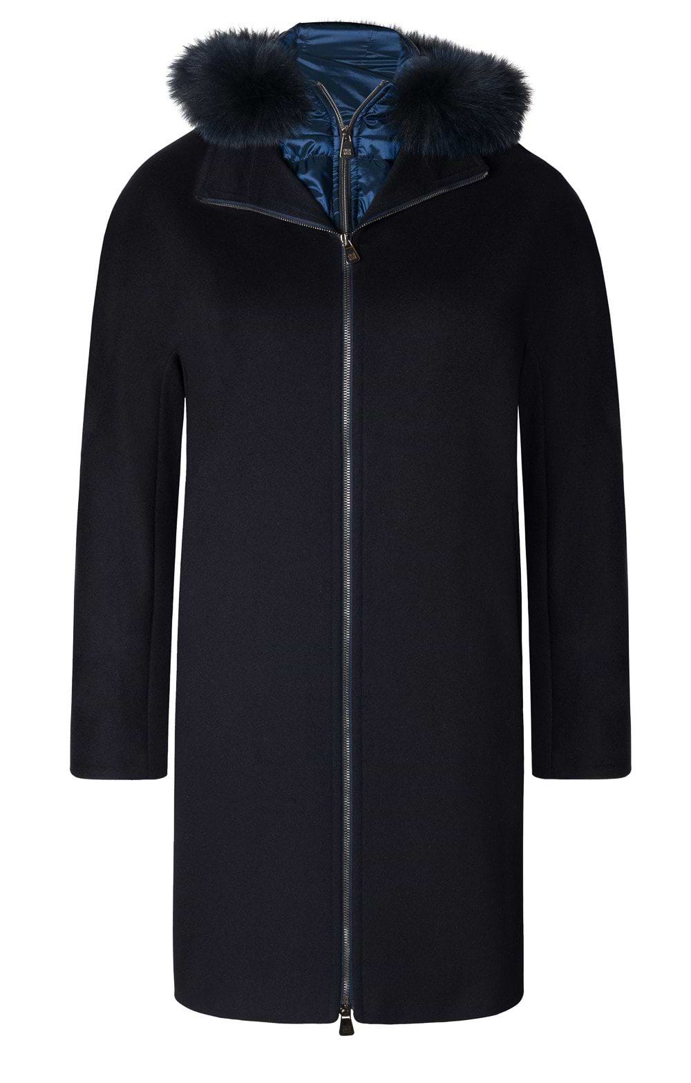 Two-in-one pure wool coat, made in Italy.Zip fastening with Cinzia Rocca zip.Stand collar.Fully lined.Optional quilted trim with quilted hood.Fox fur trim to hood.A coat that demands to be seen, you'll love wearing this with winter boots and fitted leather look trousers or jeans over your favourite cashmere knitwear.