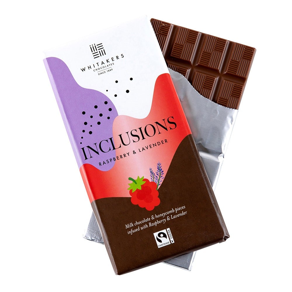 Milk Chocolate (sugar, Cocoa Butter, Whole Milk Powder, Cocoa Mass, Lactose (milk), Whey Powder (milk) Emulsifier: Soya Lecithin), Sugar, Glucose Syrup, Raspberry Flavour, Lavender Flavour, Raising Agent: Sodium Bicarbonate.