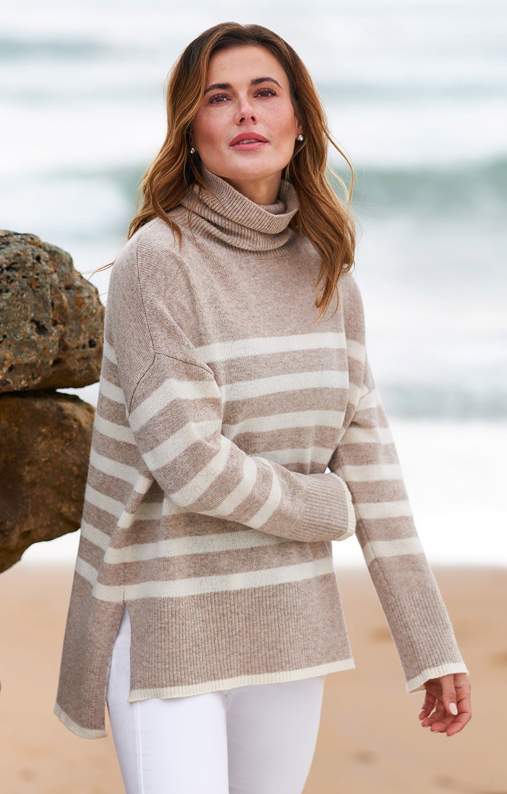 Ladies Relaxed Lambswool Striped Roll Neck Jumper