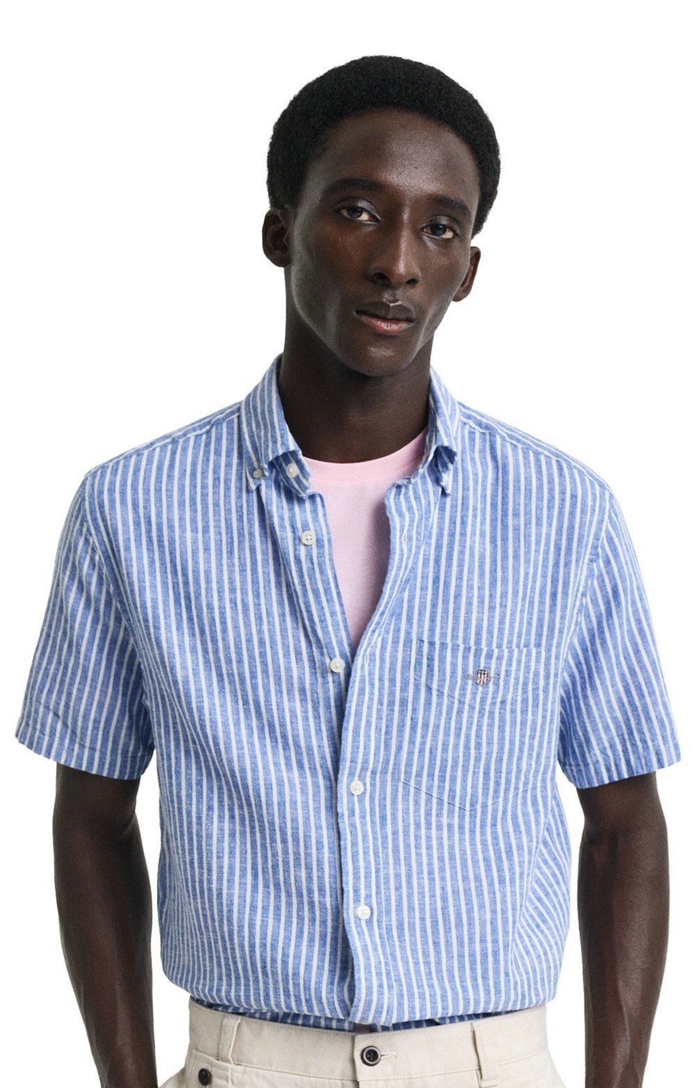 Crafted from a crisp linen-cotton blend, the men's striped Gant shirt with short sleeves offers lightness and breathability for warm summer days.