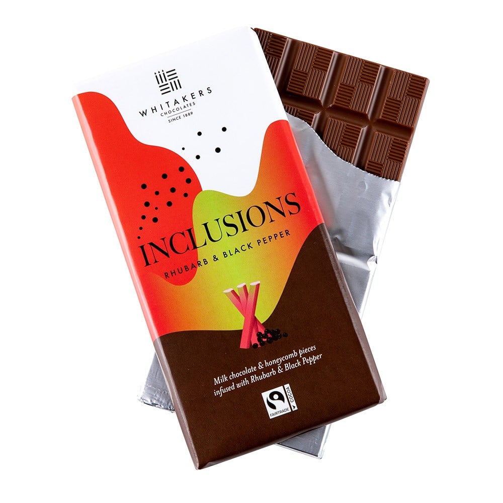 Milk Chocolate (sugar, Cocoa Butter, Whole Milk Powder, Cocoa Mass, Lactose (milk), Whey Powder (milk) Emulsifier: Soya Lecithin), Sugar, Glucose Syrup, Black Pepper Flavour, Rhubarb Flavour, Raising Agent: Sodium Bicarbonate.