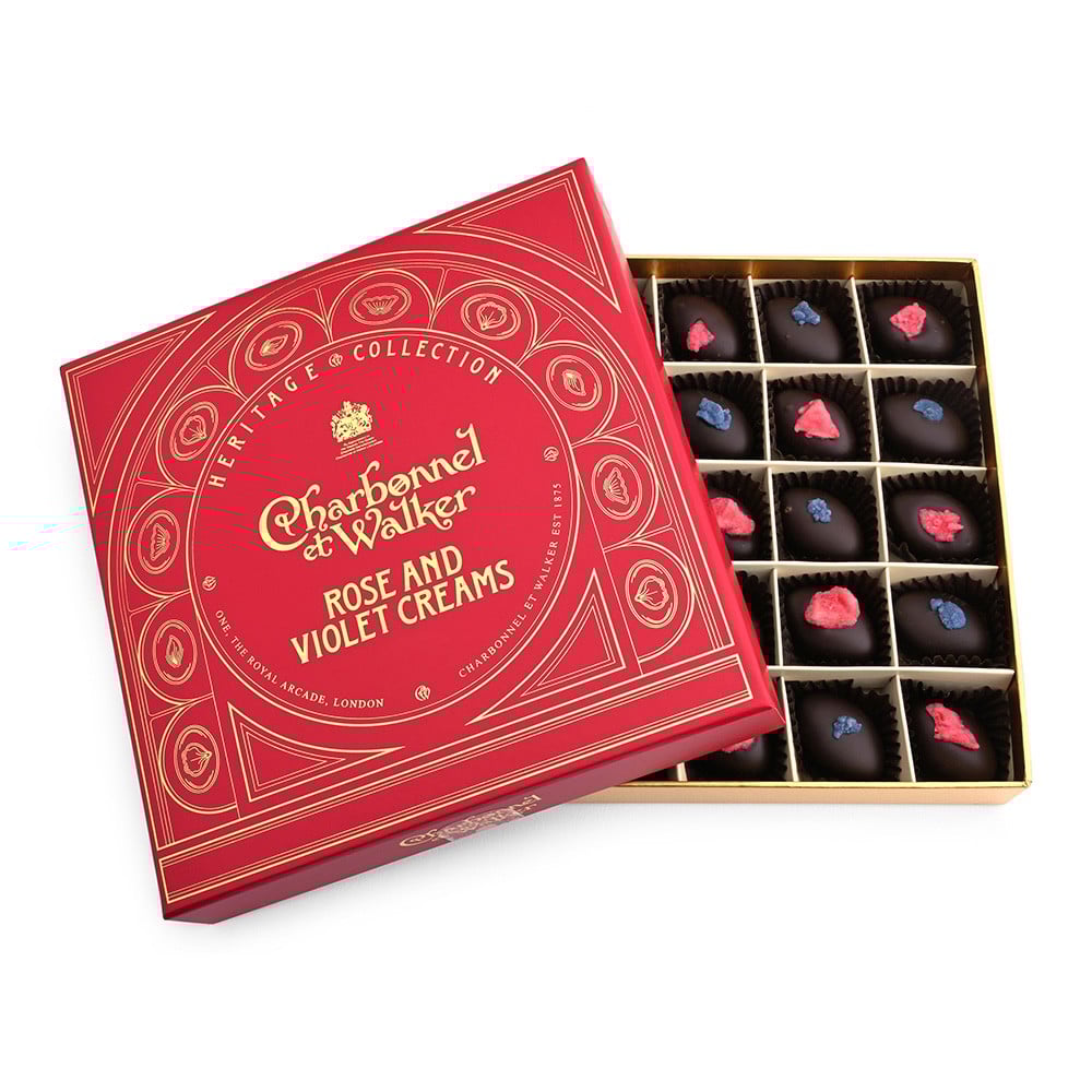Fondant (sugar, glucose syrup, water), dark chocolate (cocoa mass, sugar, cocoa Butter, emulsifier (soya lecithin)), sugar, natural flavourings, natural flowers, stabiliser (gum arabic), colours (beetroot red, cochineal, indigo carmine), flavourings.
