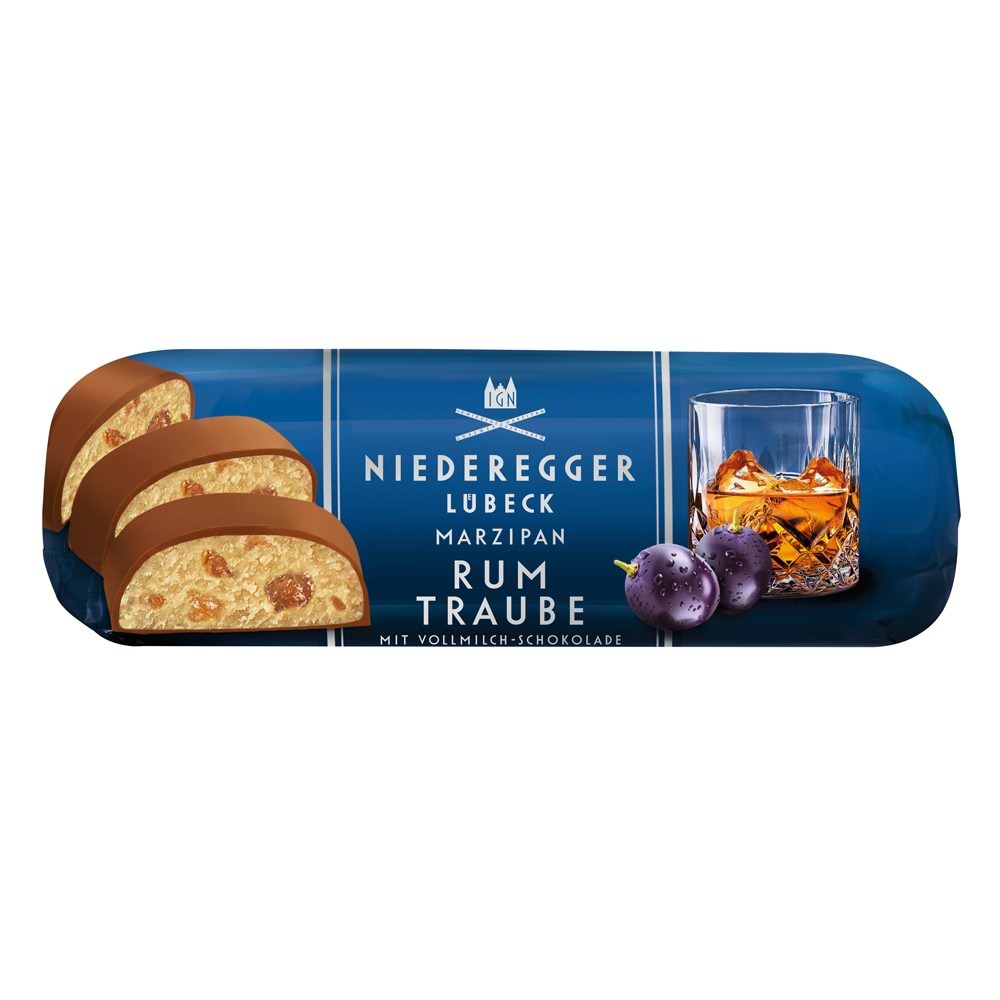Almonds 38 %, sugar, milk chocolate 22 % (sugar, cocoa butter, whole milk powder, cocoa mass, emulsifier: lecithins (soya), vanilla extract), sultanas 9.9 %, rum 3.0 %, invert sugar syrup, sunflower oil, rapeseed oil. May contain traces of other tree nuts. Cocoa solids: 33 % min. in milk chocolate. Milk solids: 14 % min. in milk chocolate.