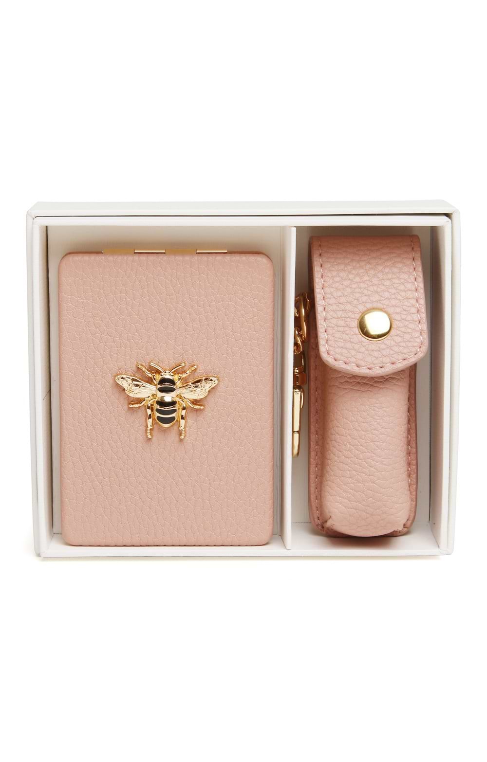 Lipstick holder and hinged compact mirror with high quality PU leather trimsPresented in branded gift boxGold-tone Alice Wheeler Bee adorns compactGold-tone frame to mirrorGold-tone keyring attachment to lipstick holderLipstick holder fastens with press-studPerfect gift for someone who loves make-upAlice Wheeler London metallic logo to rear of cardholderAn ideal present for a make-up enthusiast, or a lovely addition to your own handbag.