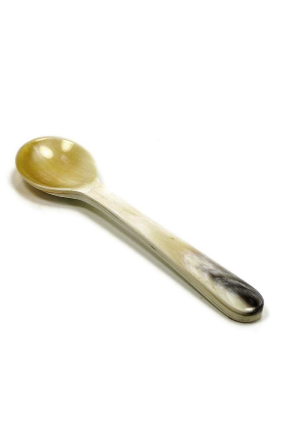 A miniature salt spoon crafted from natural horn, perfect for refined seasoning from open cellars at a refined dinner table.