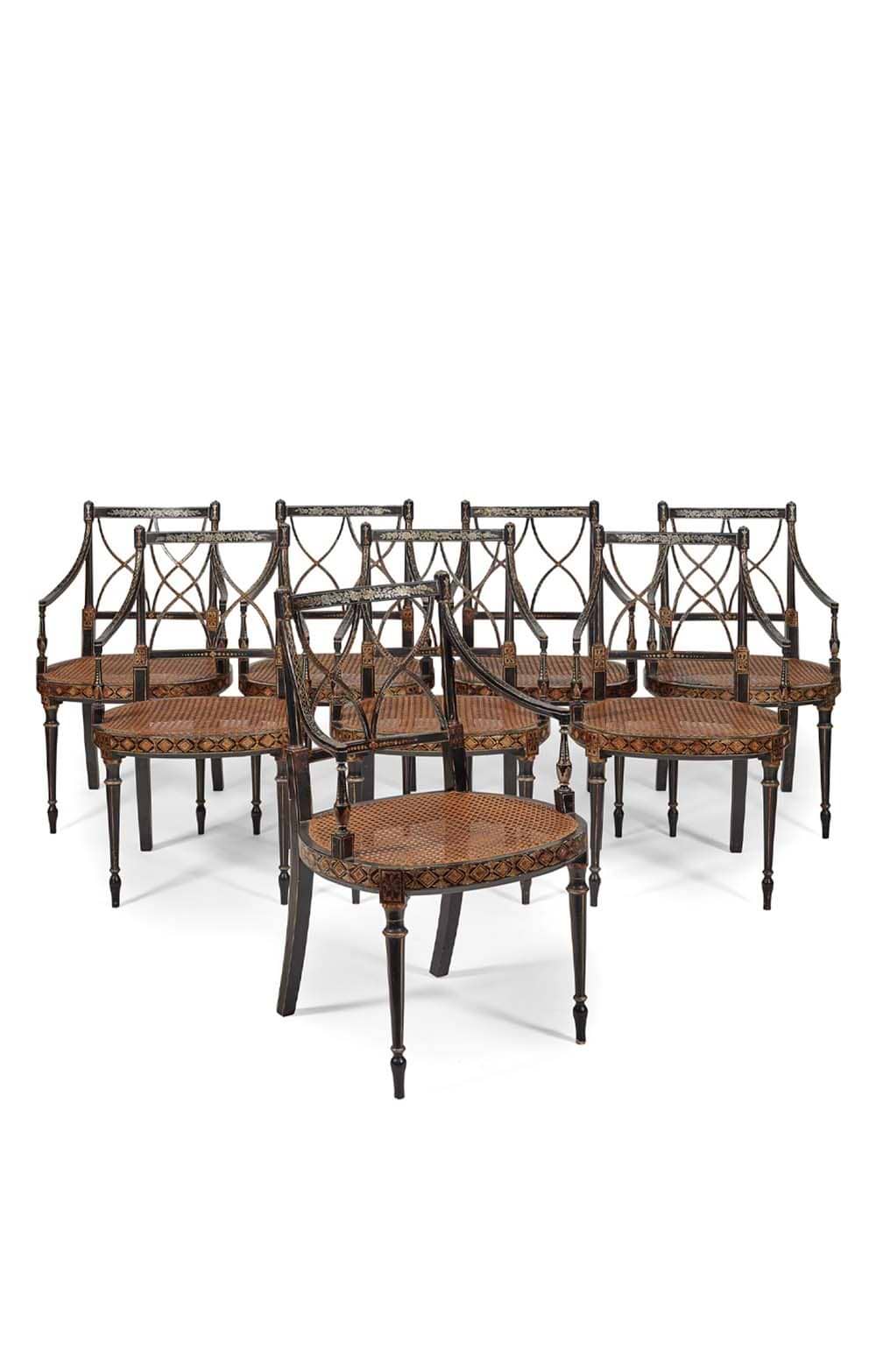 Set of Eight Regency Ebonised Silvered and Gilt Decorated Armchairs, Early 19th Century
