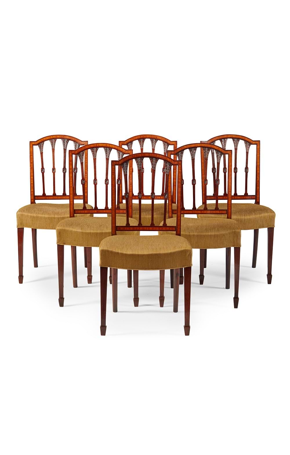 Set Of Eight Sheraton Style Mahogany And Satinwood Dining Chairs, Late 19th / Early 20th Century