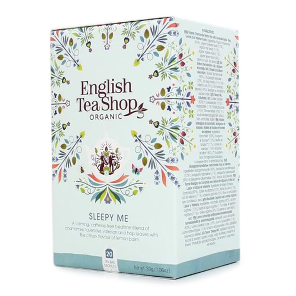 Organic Chamomile Herbal Tea with Lavender Buds, Hop Leaves and Valerian Roots. Ingredients: Organic chamomile (62%), organic lavender buds (12%), organic hop leaves (11%), organic valerian roots (11%), organic lemon balm (4%).