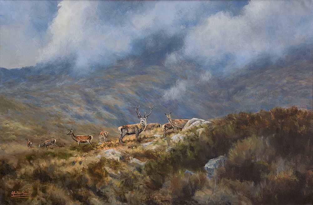 Stag and Feeding Hind on the Slopes of Slioch by Alastair Proud