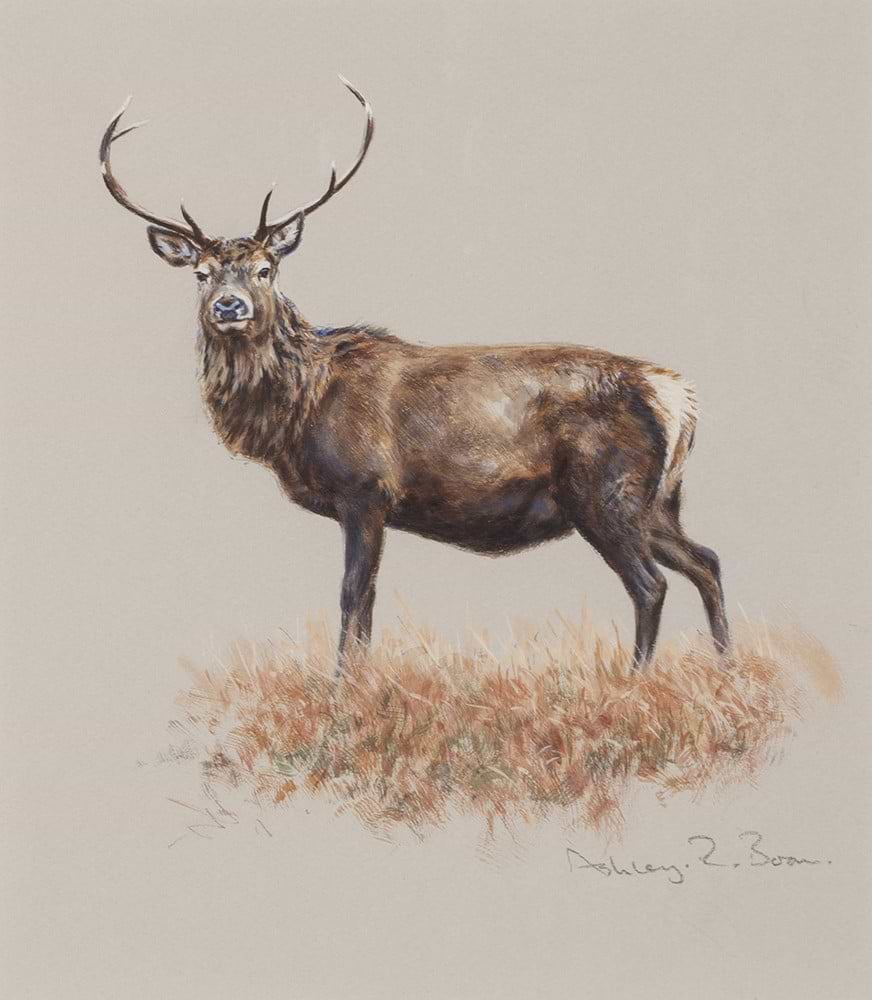 Stag in Red Grass by Ashley Boon