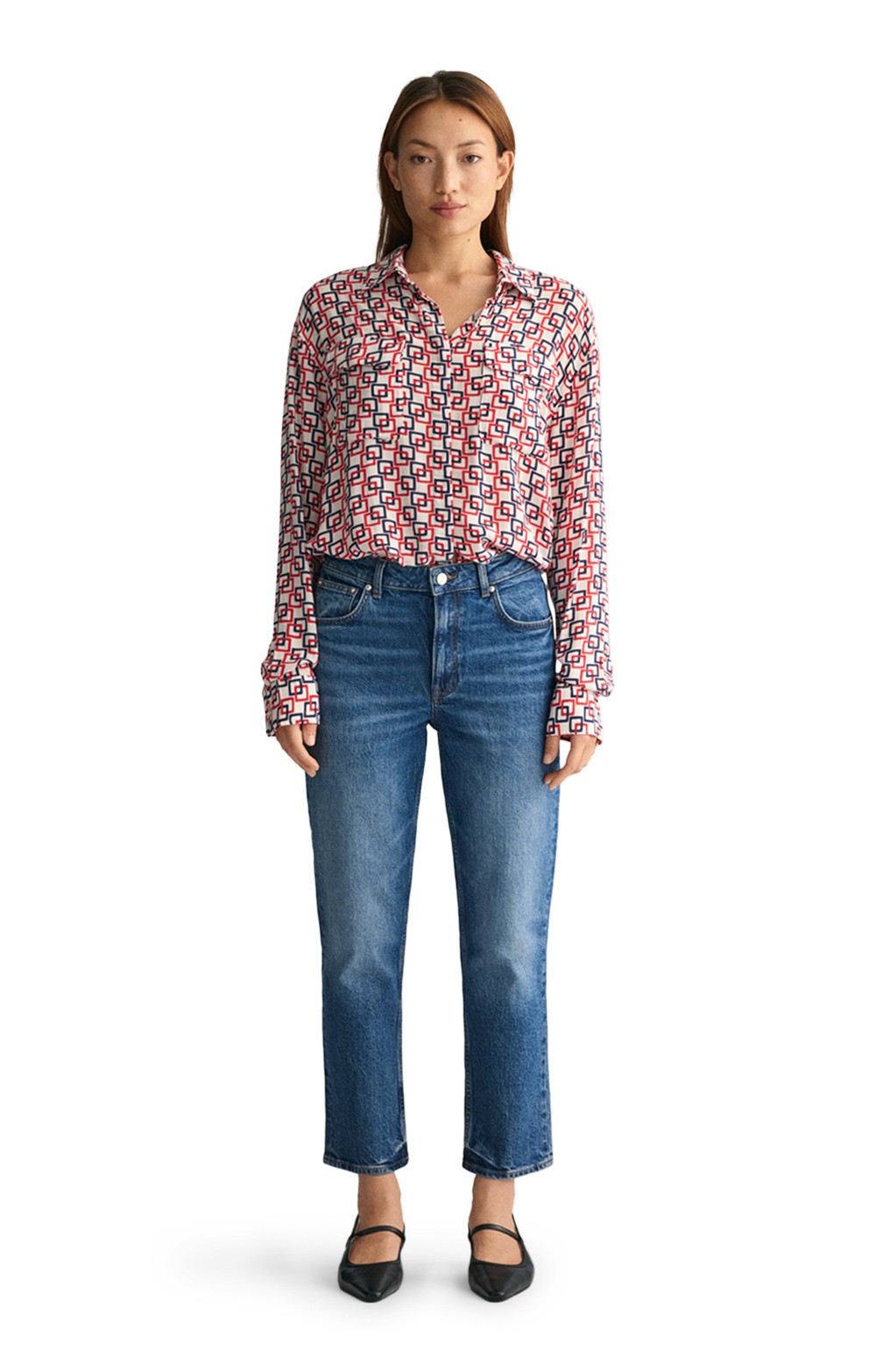 Their high-rise waist, tapered leg and cropped hem create a lengthening effect, perfect for showcasing your favourite footwear. Crafted from breathable, lightweight cotton and elastane, they offer a touch of stretch for ease of movement. Branded flat doughnut buttons and a leather Gant logo patch at the back add distinctive detailing. Ideal for both casual outings and more polished settings, these jeans are a versatile addition to your collection. Whether you're enjoying a relaxed weekend brunch or attending an evening gathering, these jeans provide the perfect balance of style and comfort.