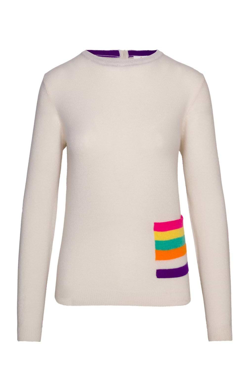 Savour the touch of luxury with this ladies stripe pocket crew neck, meticulously woven from 100% pure cashmere. This top, with its subtle ribbed hem texture and convenient pocket, offers an exquisite blend of sophistication and practicality. Its relaxed silhouette ensures a comfortable fit that drapes gracefully, making it an ideal choice for layering or as a stand-alone piece in your wardrobe.