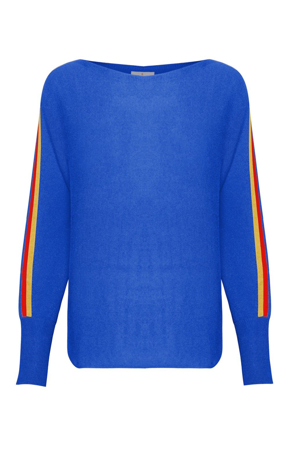 100% cashmereDolman sleevesOne centimetre rib on bottom Two centimetre rib on cuffFour coloured stripes down sleeveWhether you're out for a country walk or brunching with friends, this versatile sweater is the perfect choice.