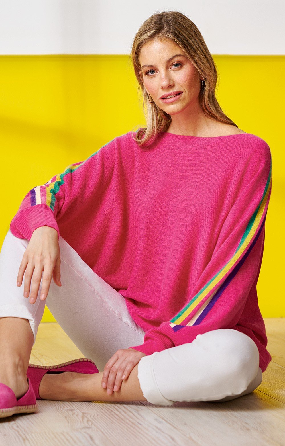 100% cashmereDolman sleevesOne centimetre rib on bottom Two centimetre rib on cuffFour coloured stripes down sleeveWhether you're out for a country walk or brunching with friends, this versatile sweater is the perfect choice.