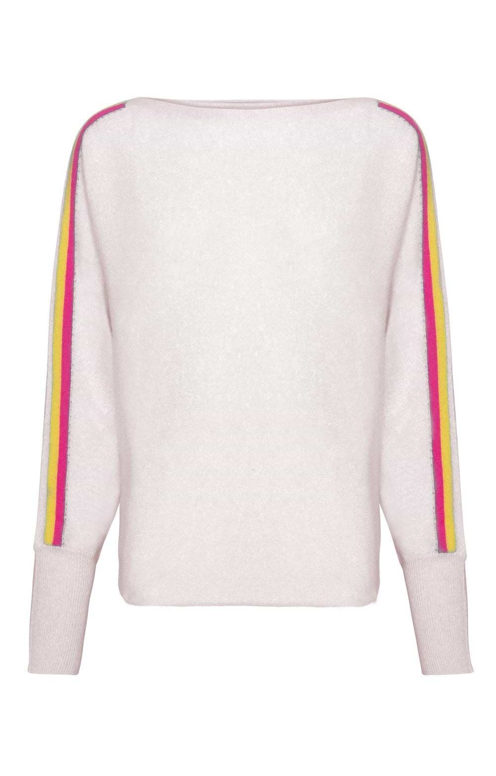 100% cashmereDolman sleevesOne centimetre rib on bottom Two centimetre rib on cuffFour coloured stripes down sleeveWhether you're out for a country walk or brunching with friends, this versatile sweater is the perfect choice.