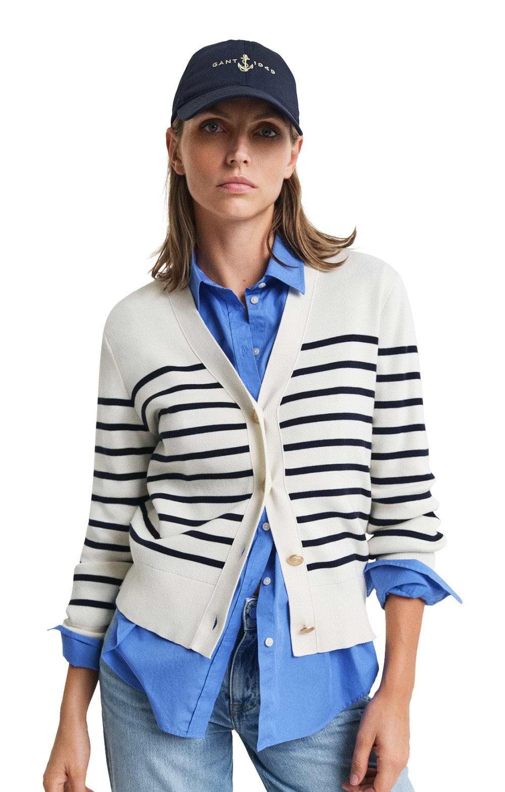 Designed with a V-neckline, it features ribbed detailing at the hem and sleeve cuffs for a structured finish. Stripes across the body and sleeves add a dynamic touch, while gold-toned buttons and an embroidered tonal Gant logo above the sleeve cuff enhance its sophisticated appeal. Balancing ease and elegance, it transitions smoothly from casual outings to polished occasions. Whether you're attending a business meeting or enjoying a weekend getaway, it brings a refined charm to any setting.