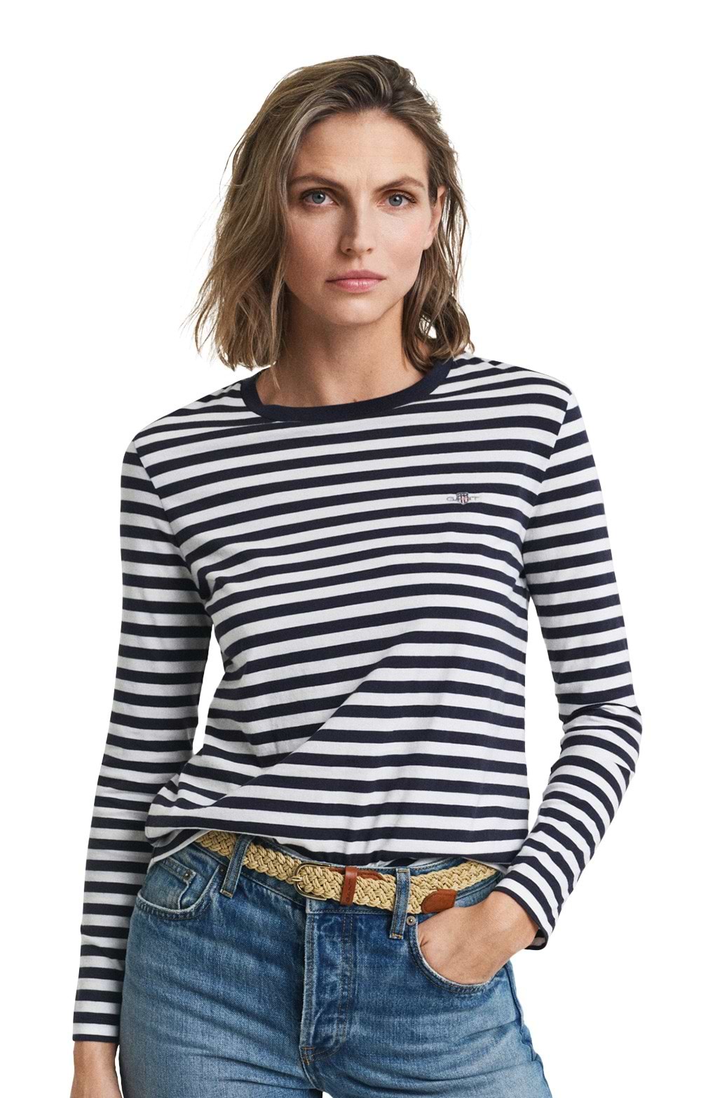 Crafted from organic cotton, the ladies Gant long-sleeved T-shirt features a Breton-inspired striped pattern and embroidered shield detail at the chest.