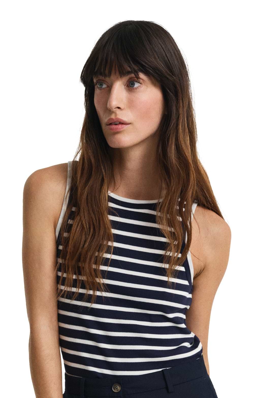 Patterned with Breton stripes and designed in a rib knit texture, the ladies Gant tank top has a high crew neck with double needle stitch detailing.