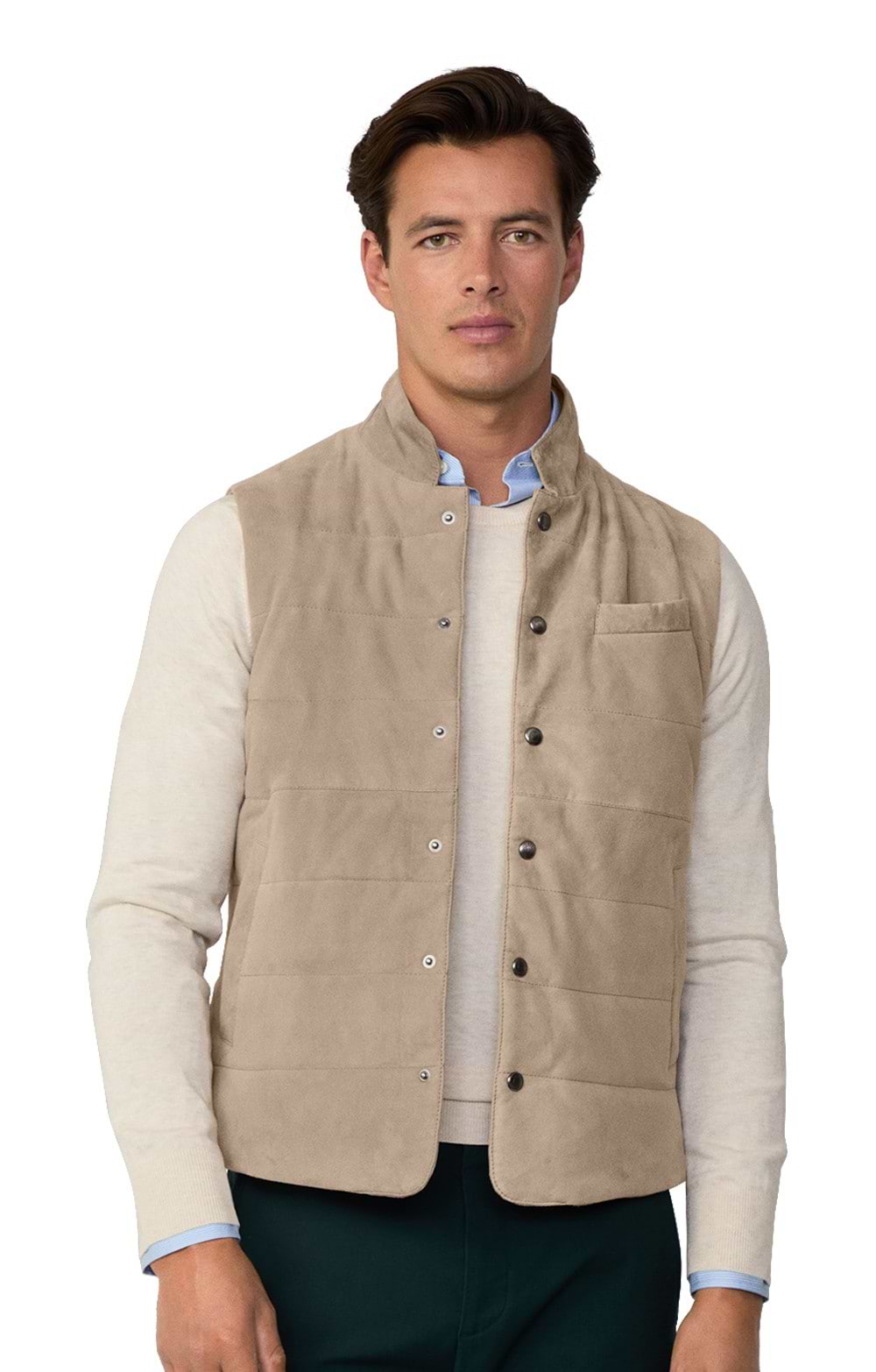 Lined gilet in soft suede.Horizontal baffle stitching.Press-stud fastening.Hand warmer pockets.This classic waistcoat will work wonderfully with a fine sweater, a crisp shirt and smart chinos, looking equally good worn around the house or about town.
