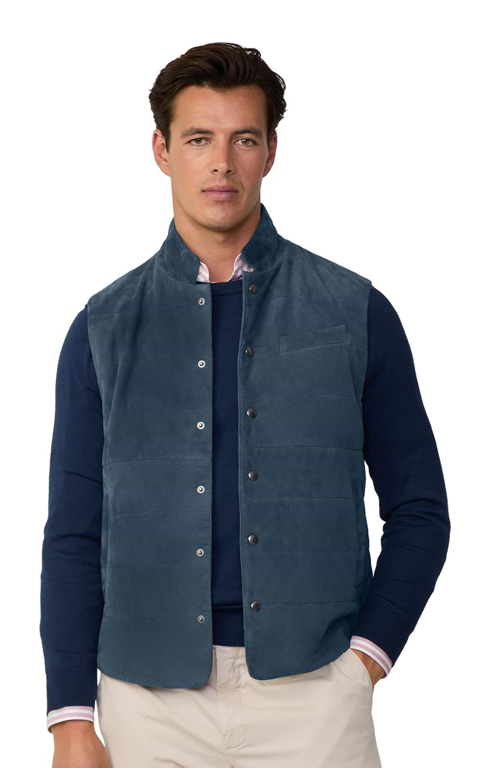 Lined gilet in soft suede.Horizontal baffle stitching.Press-stud fastening.Hand warmer pockets.This classic waistcoat will work wonderfully with a fine sweater, a crisp shirt and smart chinos, looking equally good worn around the house or about town.