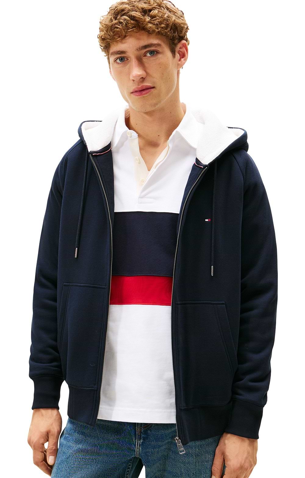 Teddy fleece lined hoodieFull zip hooded sweatshirtTeddy fleece lining for warmthLined hoodTwo adjustable drawstringsTwo spacious front pocketsRibbed hem and cuffs for structureTommy Hilfiger flag embroidery on chestPair over jeans for a warm casual look or under a long coat for the colder months.