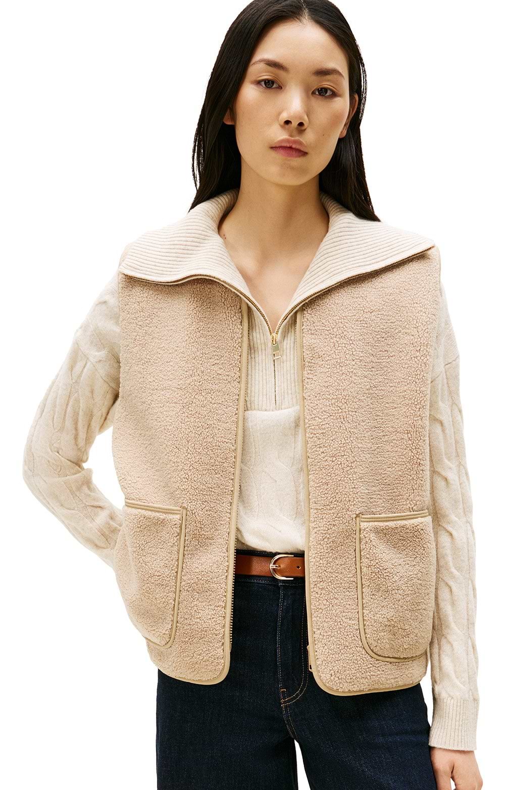 Bonded teddy fleece giletCollarlessZip-thruTwo front patch pocketsFully linedSignature tape inside necklineTommy Hilfiger tonal flag embroidery on pocketPerfect for layering during transitional seasons, team with a lightweight jumper and straight-leg jeans for casual elegance, or pair with a crisp shirt and tailored trousers for smart-casual versatility.