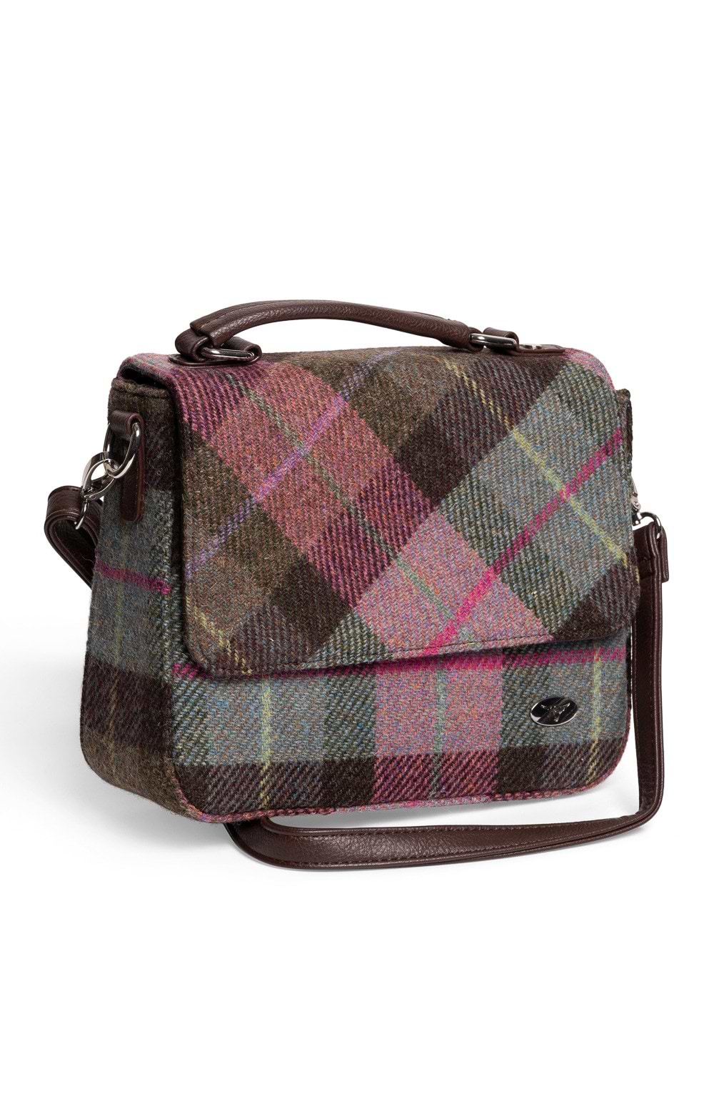 Foldover bag in Harris Tweed®Faux-leather carry handle to topDetachable and adjustable shoulder strapSilvertone hardwareGlen Appin metallic logo badge to lower frontUsing a rustic country tweed but crafting it into a smart, non-slouch design makes this bag extremely adaptable, quite suitable for daily errands or smarter occasions. Needless to say, it makes a fabulous gift for Harris Tweed® addicts, or just someone looking to add something different to their bag collection.