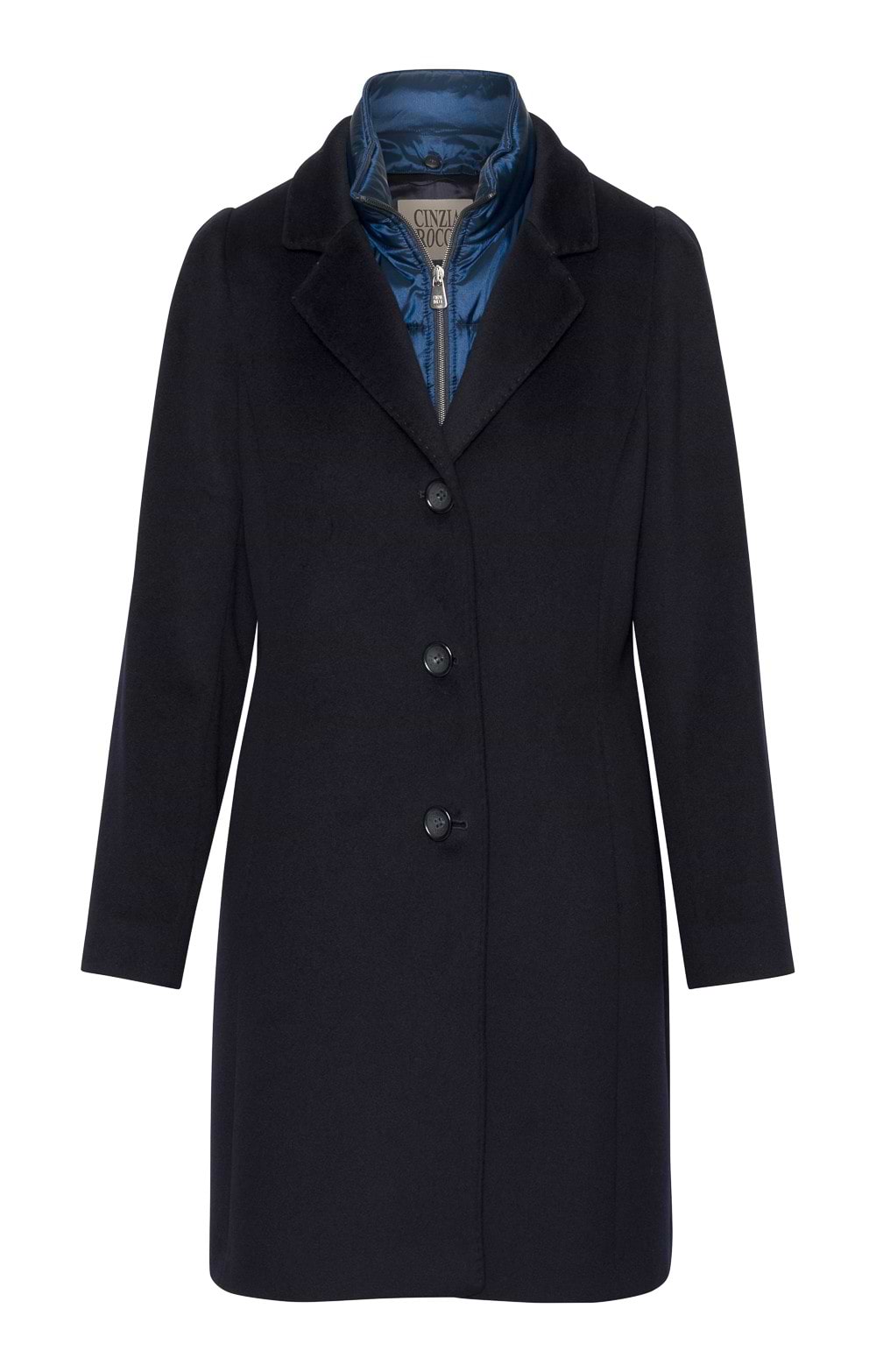 Knee-length pure wool coat with removable quilted zip collar and bib.Single breasted.Tailored fit with subtle flare.Branded Cinzia Rocca metallic zip and tonal buttons.In seam pockets.Hand-done pick-stitching to edges.Perfect for a wide variety of formal and informal scenarios, this coat will be ideal over a dress and heels for a formal autumn event, and with the quilted trim added it will look great as you wander Christmas markets or move through the airport.