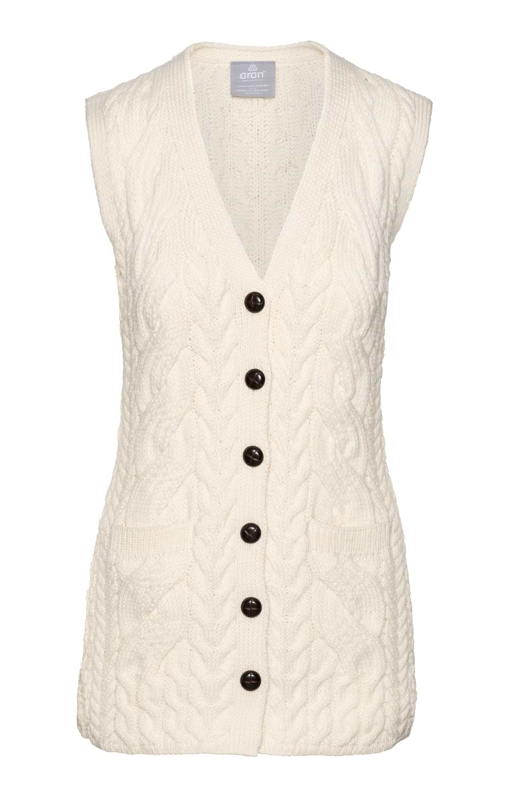 Aran cable knit sleeveless cardiganSuper soft merino woolTwo front pocketsFaux leather button fasteningKnit in IrelandWear over a long sleeve top or dress during the colder months or with a tee and bare arms for the warmer weather.