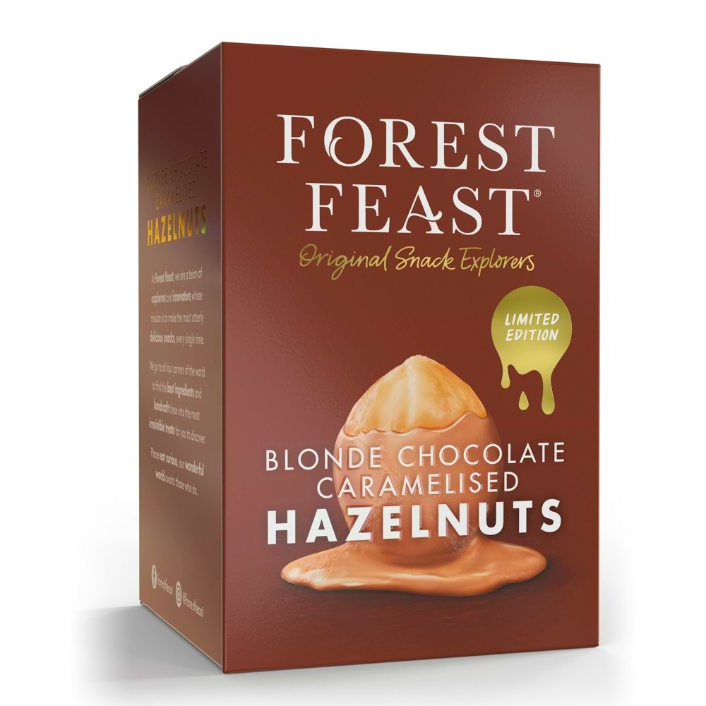 Salted Caramel Hazelnuts (50%), (hazelnuts, sugar, dark brown sugar, glazing agent (gum arabic), vanilla seasoning (dextrose, sugar, natural flavouring), golden syrup, salt, sunflower oil), Blonde Chocolate (49%) (cocoa butter, sugar, whole milk powder, milk sugar, whey powder (milk), skimmed milk powder, caramelised sugar, emulsifier (soya lecithin), natural flavouring, salt), Glazing Agent (gum arabic).