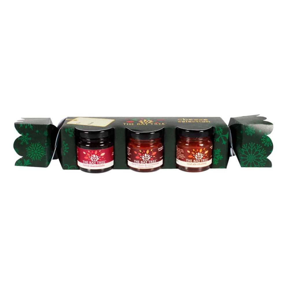 The bay tree 3 jar cracker cheese is a delightful trio of chutneys packaged in an elegant cracker-shaped box, designed to elevate any cheese board.
