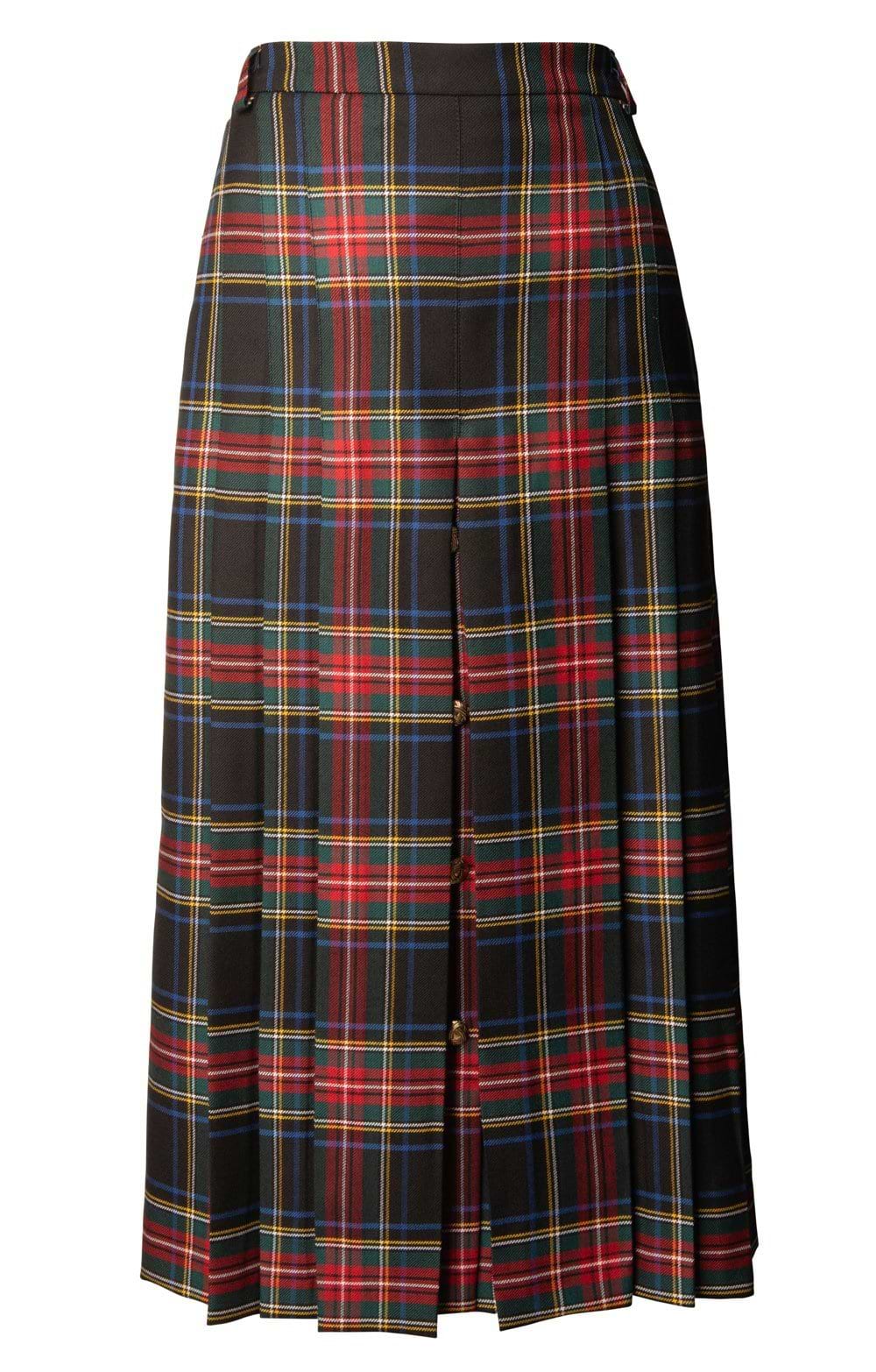 A contemporary midi-length design, this skirt offers a flattering fit that hugs the figure before easing into a pleated style. In a modern style, the skirt combines plaid and pleats, to create a piece reminiscent of a traditional kilt and imbued with Scottish culture. The zip fastening, button closure, belt loops and half lining offer plenty of practicality while the gold accent buttons add a touch of luxury to the skirt. Constructed from pure new wool, this skirt is sturdy and incredibly warm, perfect for layering in the colder months.